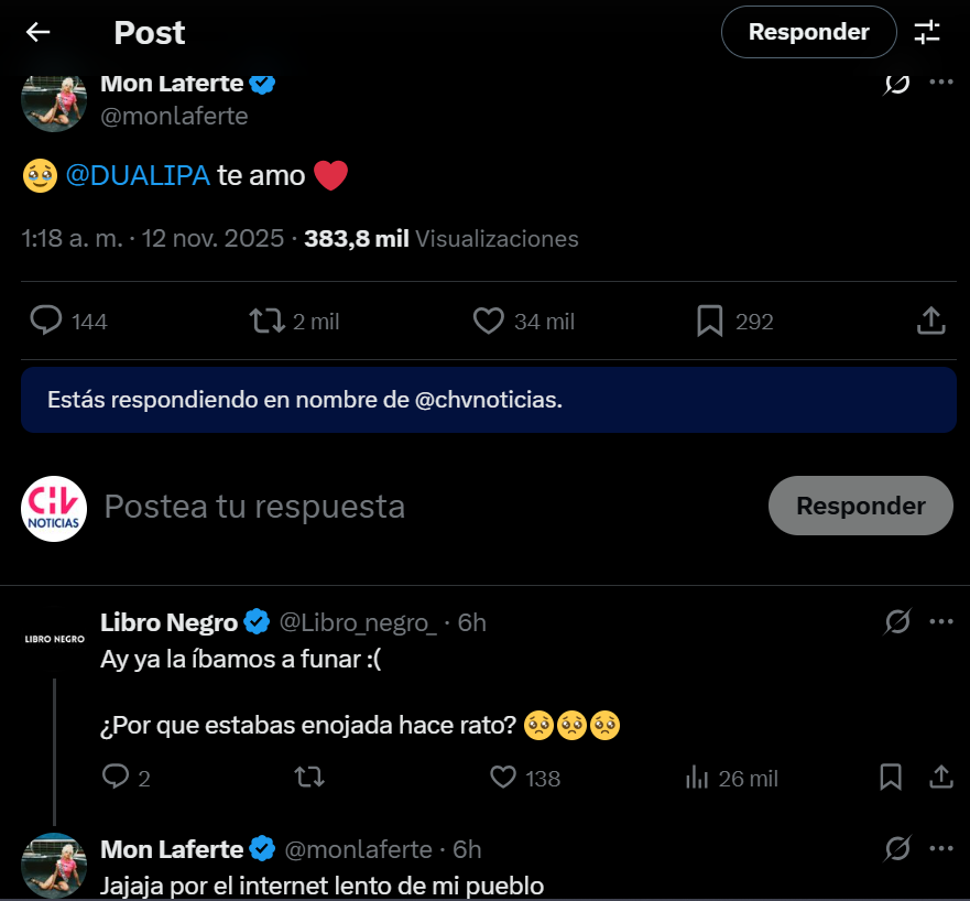 Tras esto, Mon Laferte publicó a través de su cuenta de X un emoji de cara enojada, lo que generó una ola de comentarios y especulaciones, donde algunos usuarios se preguntaban si le molestaba el homenaje de Dua Lipa.