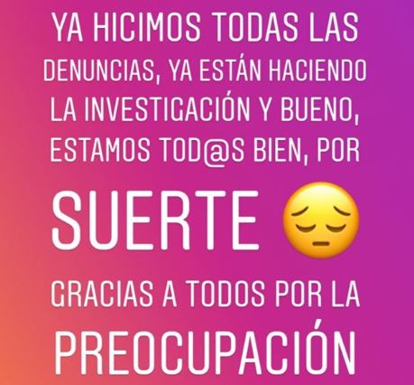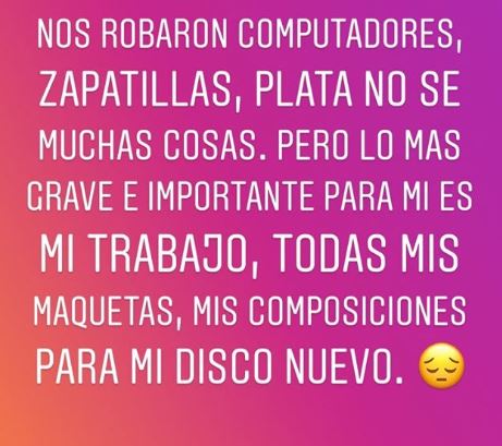 “Nos robaron, computadores, zapatillas, plata, no sé muchas cosas. Pero lo más grave e importante para mí es mi trabajo, todas mis maquetas, mis composiciones para mi disco nuevo”, dice parte del mensaje que subió la artista a sus historias de Instagram