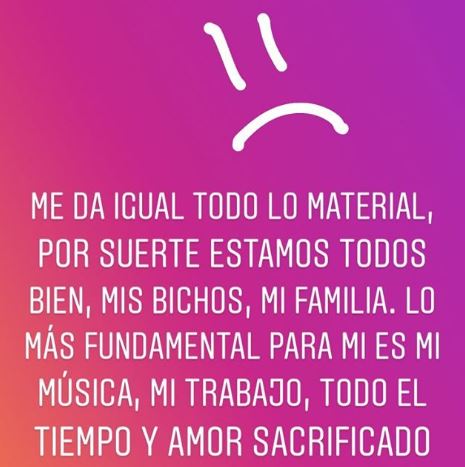“Me da igual todo lo material, por suerte estamos todos bien, mis bichos, mi familia. Lo más fundamental para mí es mi música, mi trabajo, todo el tiempo y amor sacrificado”, añadió la cantante.