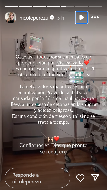 "Gracias a todos por sus mensajes de preocupación por Isi Carvallo", partió escribiendo Pérez. "Les cuento que está hospitalizada en la UTI, con cetoacidosis diabética".
