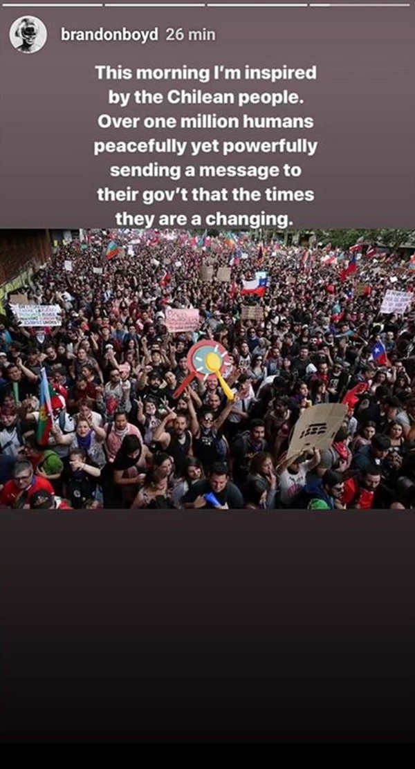 "Esta mañana estoy inspirado por los chilenos. Más de un millón de personas enviando un mensaje pacífico pero poderoso a su gobierno acerca que los tiempos están cambiando", escribió el cantante en una historia de Instagram.