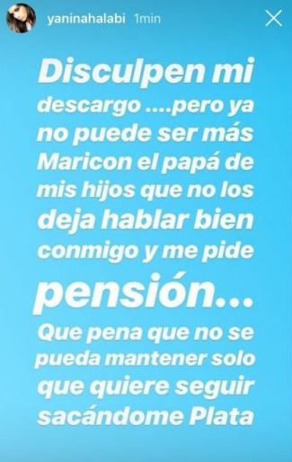 “Ya no puede ser más maricón el papá de mis hijos que no los deja hablar bien conmigo y me pide pensión… Qué pena que no se pueda mantener solo, que quiere seguir sacándome plata”, escribió en una de sus stories de la red social.