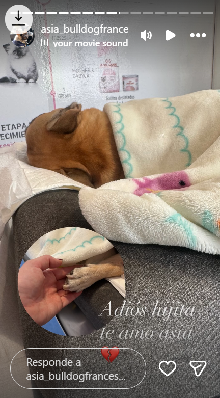 "Adiós, hijita. Te amo, Asia", escribió Adriana en sus redes sociales, donde mostró una fotografía de su perrita cubierta por una manta y otra donde sostiene una de sus patitas.