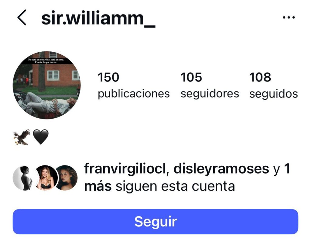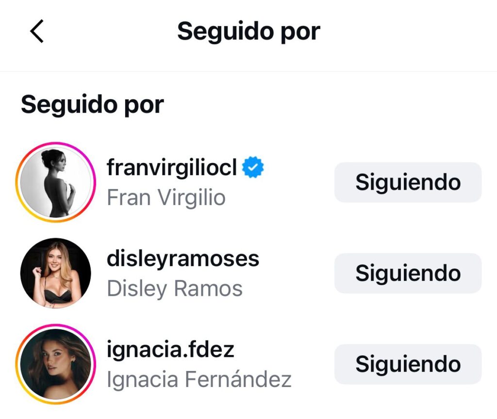 Finalmente, este perfil de Instagram sigue a Disley Ramos, expareja de Maripán, Fran Virgilio, con quien es amigo hace 7 años e Ignacia Fernández.
