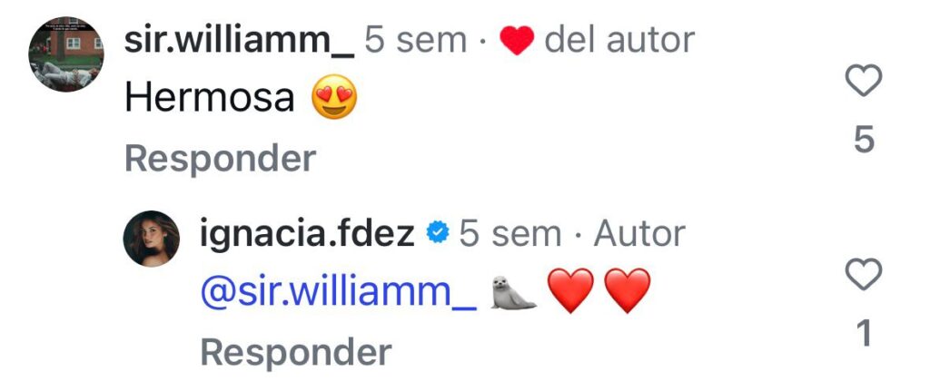 Cabe destacar que el pasado 21 de febrero, esta cuenta le comentó “Hermosa” a Ignacia Fernández en un video de ella desfilando por la gala del Festival de Viña. Al respecto, ella respondió con un emoji de foca y un corazón.