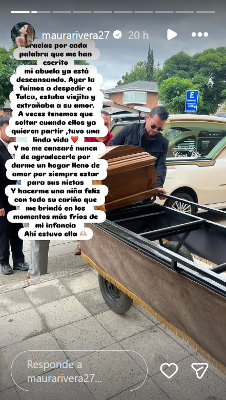 "Gracias por cada palabra que me han escrito. Mi abuela ya está descasando. Ayer la fuimos a despedir a Talca. Estaba viejita y extrañaba a su amor", señaló Maura Rivera a través de las historias de su cuenta de Instagram.