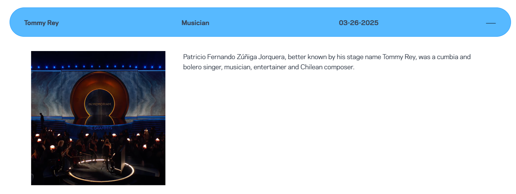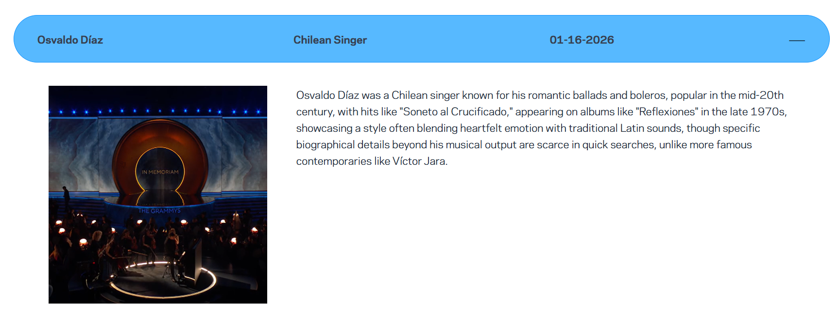 En la plataforma de In Memoriam, la organización dedicó reseñas a artistas de todo el mundo, incluidos tres chilenos: Miguel 'Negro' Piñera, Tommy Rey y Osvaldo Díaz.