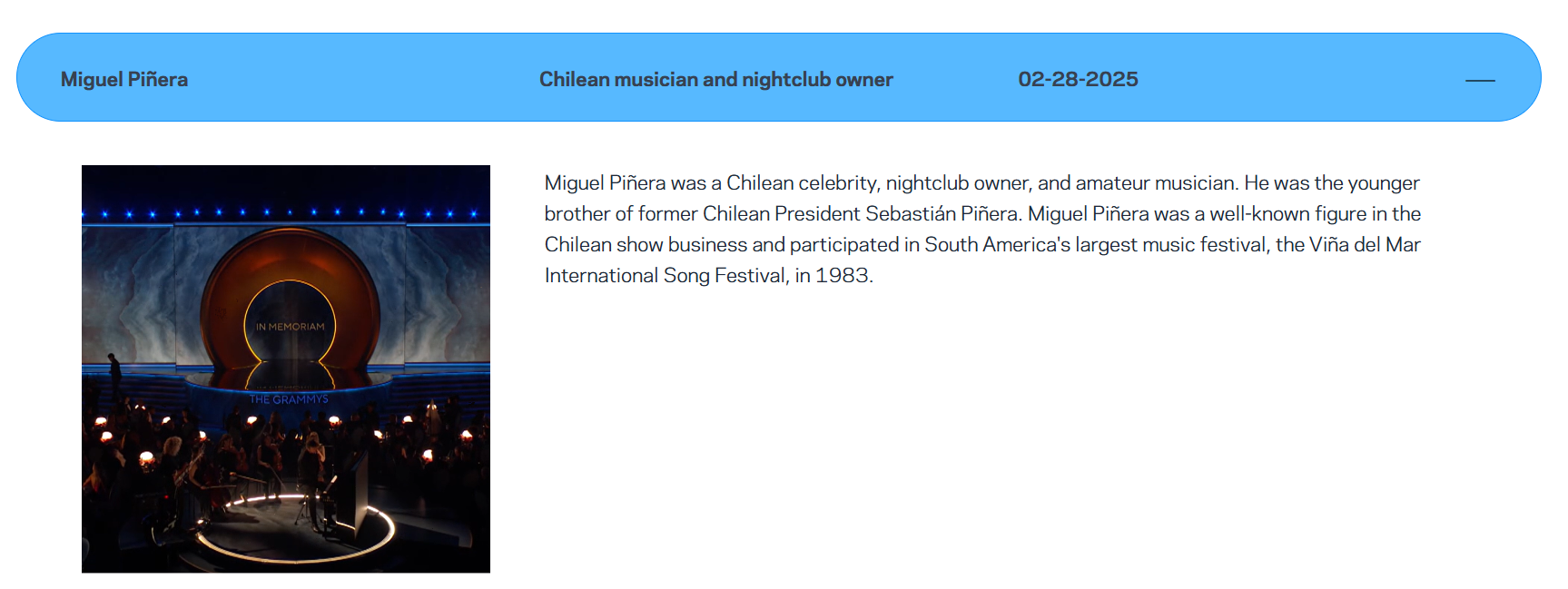 El primero en ser destacado por la Academia fue Miguel 'Negro' Piñera, "una celebridad chilena, dueña de un club nocturno y músico aficionado", quien falleció el 28 de febrero de 2025.