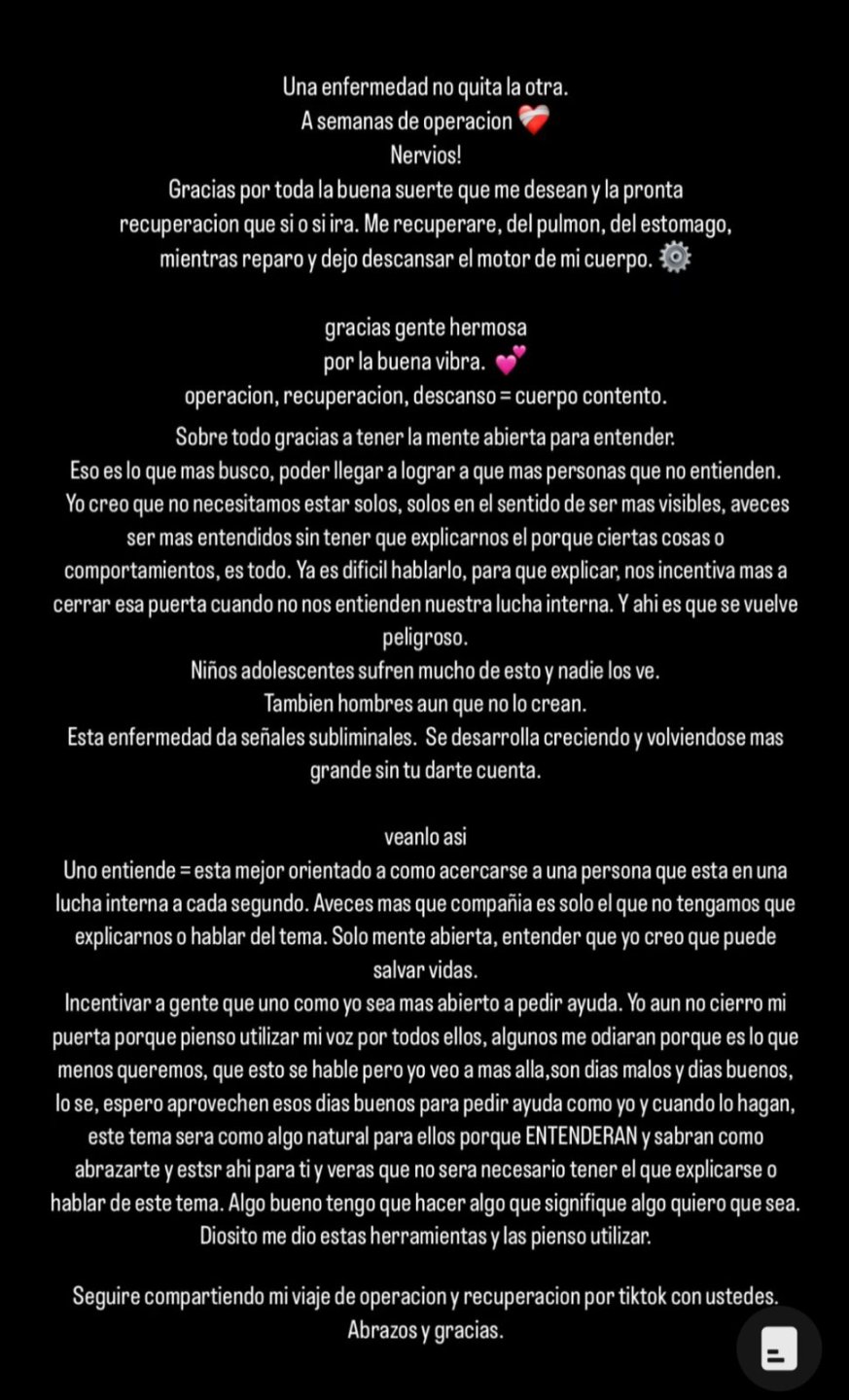 Finalmente, el influencer prometió mostrar su proceso de recuperación mediante TikTok a fin de concientizar y así poder lograr que estos temas se hablen abiertamente: "Pienso utilizar mi voz por todos ellos, algunos me odiarán porque es lo que menos queremos, que esto se hable, pero yo veo más allá", concluyó.