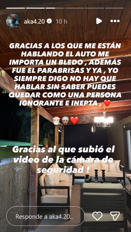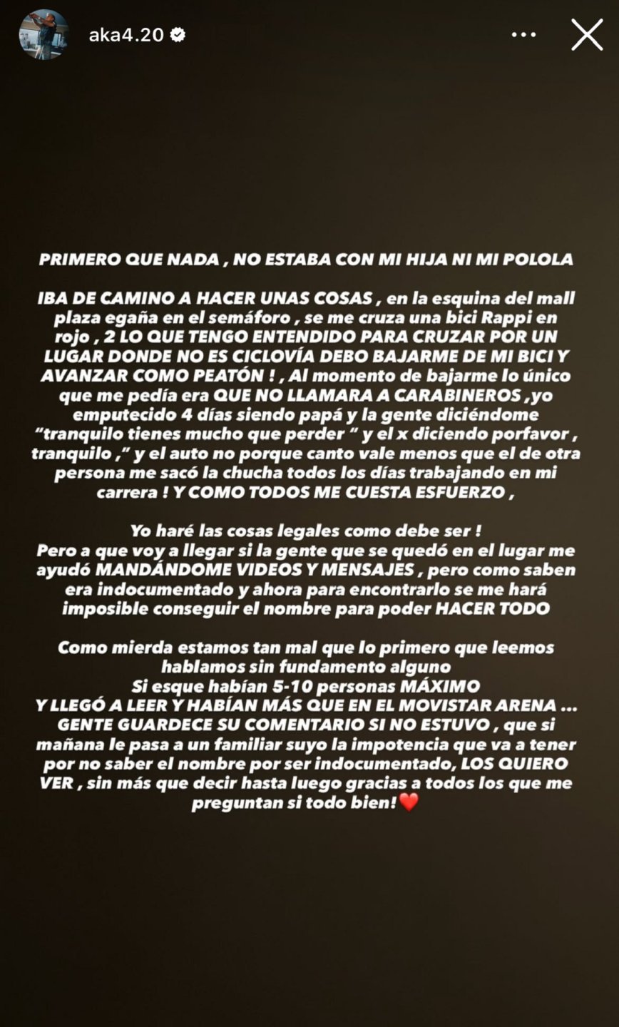 En esa misma línea, el cantante urbano también pidió ayuda para ver las cámaras de Santiago y luego borró las publicaciones que fueron recopiladas por Infama, quienes también compartieron el relato de una testigo: "Este c... del Aka4.20 lo atropelló, le rajó la bici al panita que andaba trabajando. H... patético".