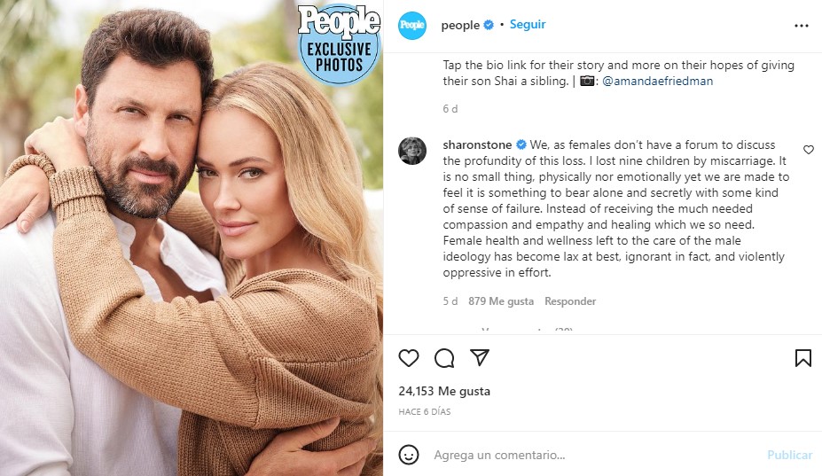 La protagonista de la afamada cinta “Bajo Instintos” habló sobre este mal momento de sus vida en una publicación realizada por la cuenta de Instagram de la Revista People, luego de que el medio publicara el drama de Peta Murgatroyd, bailarina de “Dancing With The Stars”, quien perdió un bebé mientras su marido Maks Chmerkovskiy, también bailarín, estaba en su Ucrania natal.