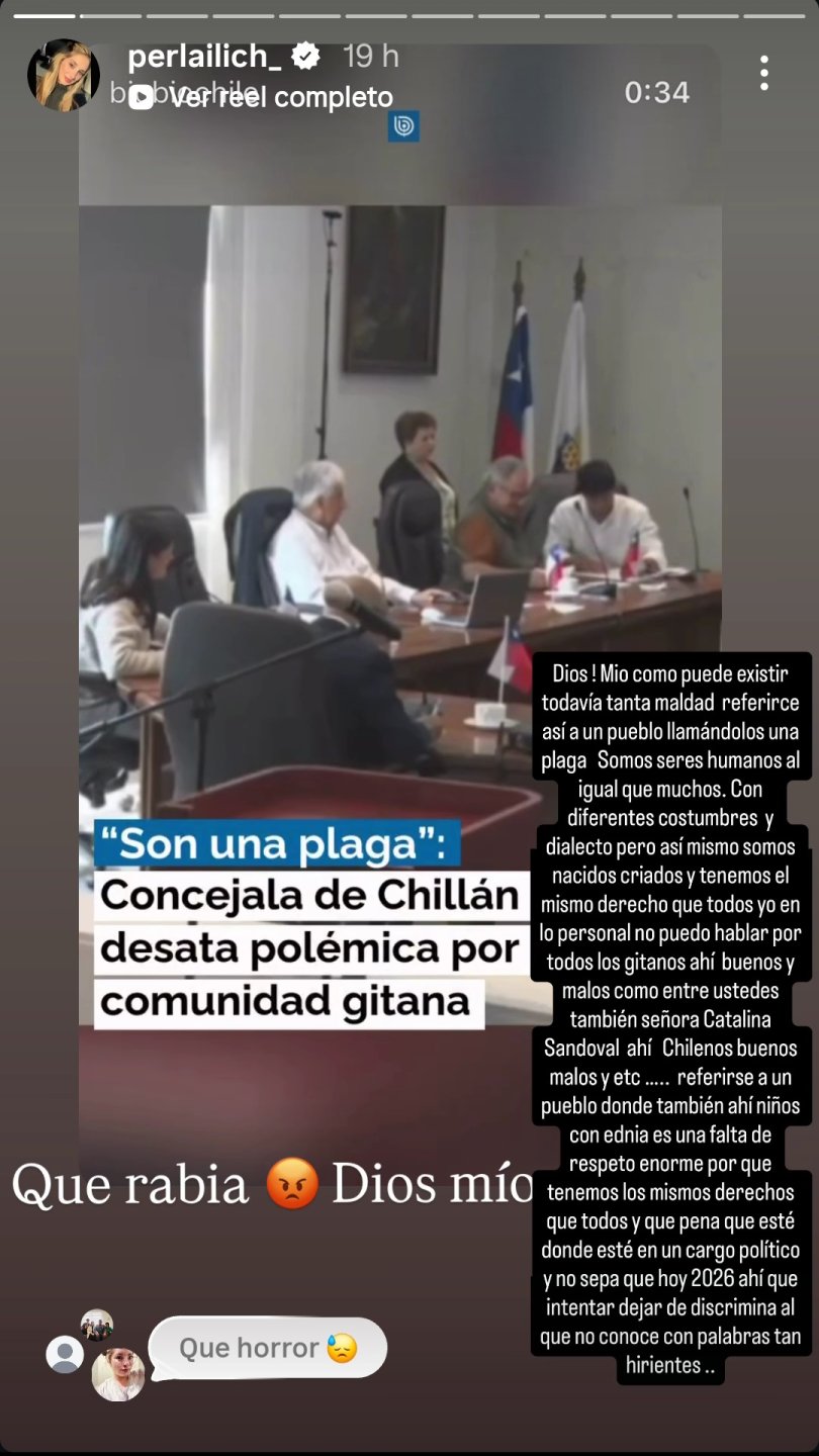 Por su parte, Linda Marcovich también expreso su molestia ante las palabras de Catalina Sandoval y recalcó que “no somos una plaga como muchos quieren hacernos ver. Y quiero decir algo muy claro: Yo no me hago responsable de cada gitano que exista. No todos nos conocemos ni todos somos familia y no todos somos iguales. Como en cualquier comunidad hay personas buenas y personas malas”.
