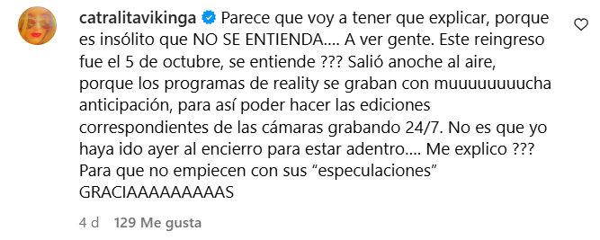 A través de su cuenta de Instagram, Catalina señaló: "Parece que voy a tener que explicar porque es insólito que no se entienda. A ver gente, este reingreso fue el 5 de octubre, ¿se entiende?".