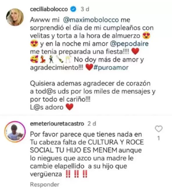 Todo comenzó cuando la ex Miss Universo compartió una publicación en su cuenta oficial de Instagram celebrando su cumpleaños, junto a su hijo. Las fotografías se llenaron de comentarios positivos y felicitaciones. Sin embargo, hubo uno que llamó la atención, el del empresario.