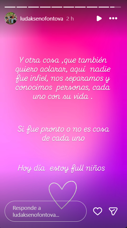 Finalmente, Ludmila concluyó: "Y otra cosa que también quiero aclarar: aquí nadie fue infiel. Nos separamos y conocimos personas. Cada uno con su vida. Si fue pronto o no es cosa de cada uno. Hoy día estoy full niños".