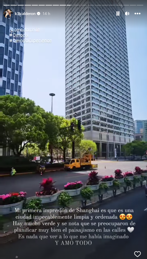 "Mi primera impresión de Shanghái es que es una ciudad impecablemente limpia y ordenada. Hay mucho verde y se nota que se preocuparon de planificar muy bien el paisajismo en las calles. Es nada que ver a lo que había imaginado", confesó junto a un video en el que mostró parte de la ciudad.