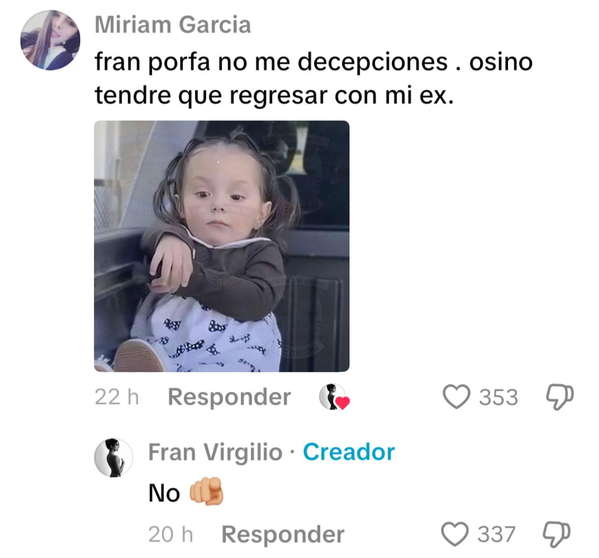 En los comentarios, una seguidora escribió: "Fran, por fa no me decepciones, o si no tendré que regresar con mi ex", y ella respondió: "No", seguido de un emoji apuntando a quien lee.