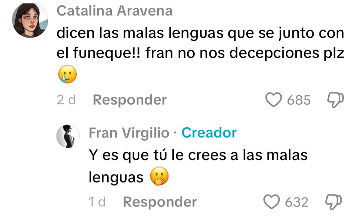 En esa misma línea, otra usuaria señaló: "¡Dicen las malas lenguas que se juntó con el funeque! (sic) Fran, no nos decepciones, please", a lo que Virgilio contestó: "Y es que tú le crees a las malas lenguas".