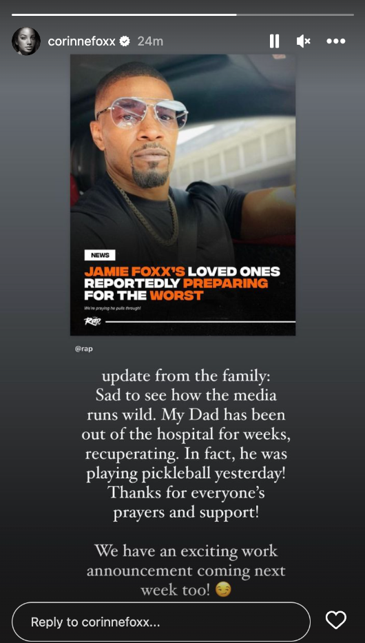 A través de una storie en su cuenta de Instagram, Corinne Foxx entregó una actualización de la familia en la que indicó que "es triste ver cómo los medios se vuelven locos".