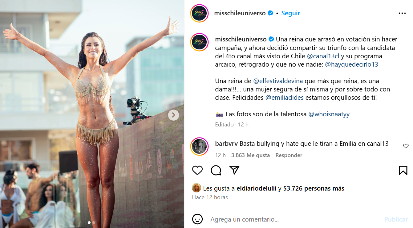 Luego, llenó de elogios a Emilia por su logro en Viña. "Más que reina, es una dama!!! Una mujer segura de sí misma y por sobre todo con clase. Felicidades Emilia Dides, estamos orgullosos de ti", cerraron.