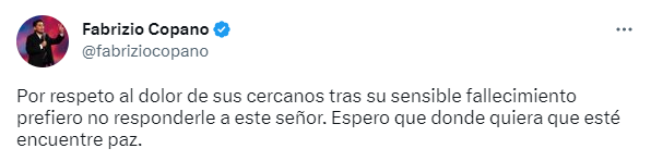 A pocas horas de la entrevista, fue el mismo Fabrizio Copano quien acusó recibo de las polémicas declaraciones de Hirane. En ese sentido, fue hasta su cuenta de Twitter para responder directamente al humorista. Aunque sin hacer alusión directa a las críticas, el comediante publicó un particular tuit que rápidamente se hizo viral en la red social. "Por respeto al dolor de sus cercanos tras su sensible fallecimiento prefiero no responderle a este señor. Espero que donde quiera que esté encuentre paz", escribió en la plataforma.