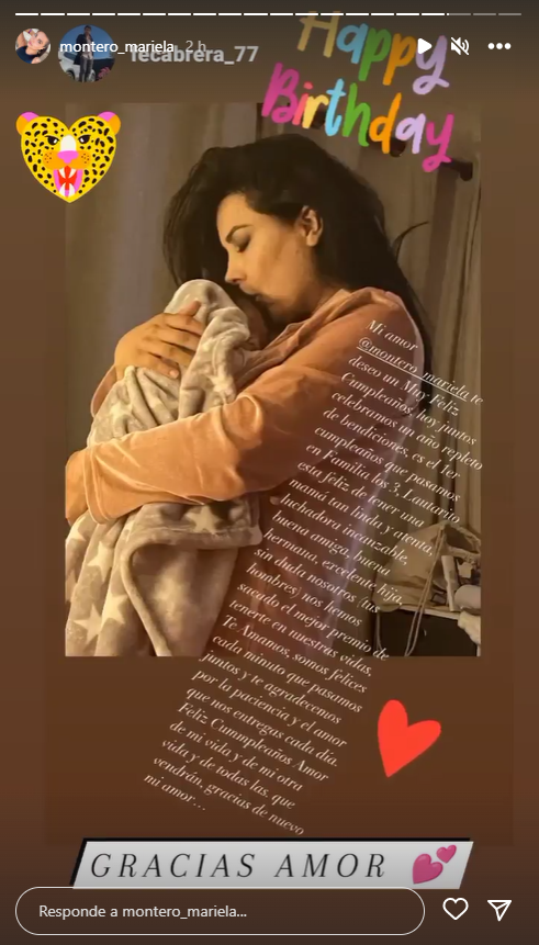 Tras conocerse hace algunos años y entablar una relación, Cabrera dedicó una postal en sus historias de Instagram en las que se ve a la ex participante de Pelotón cargando al bebé.