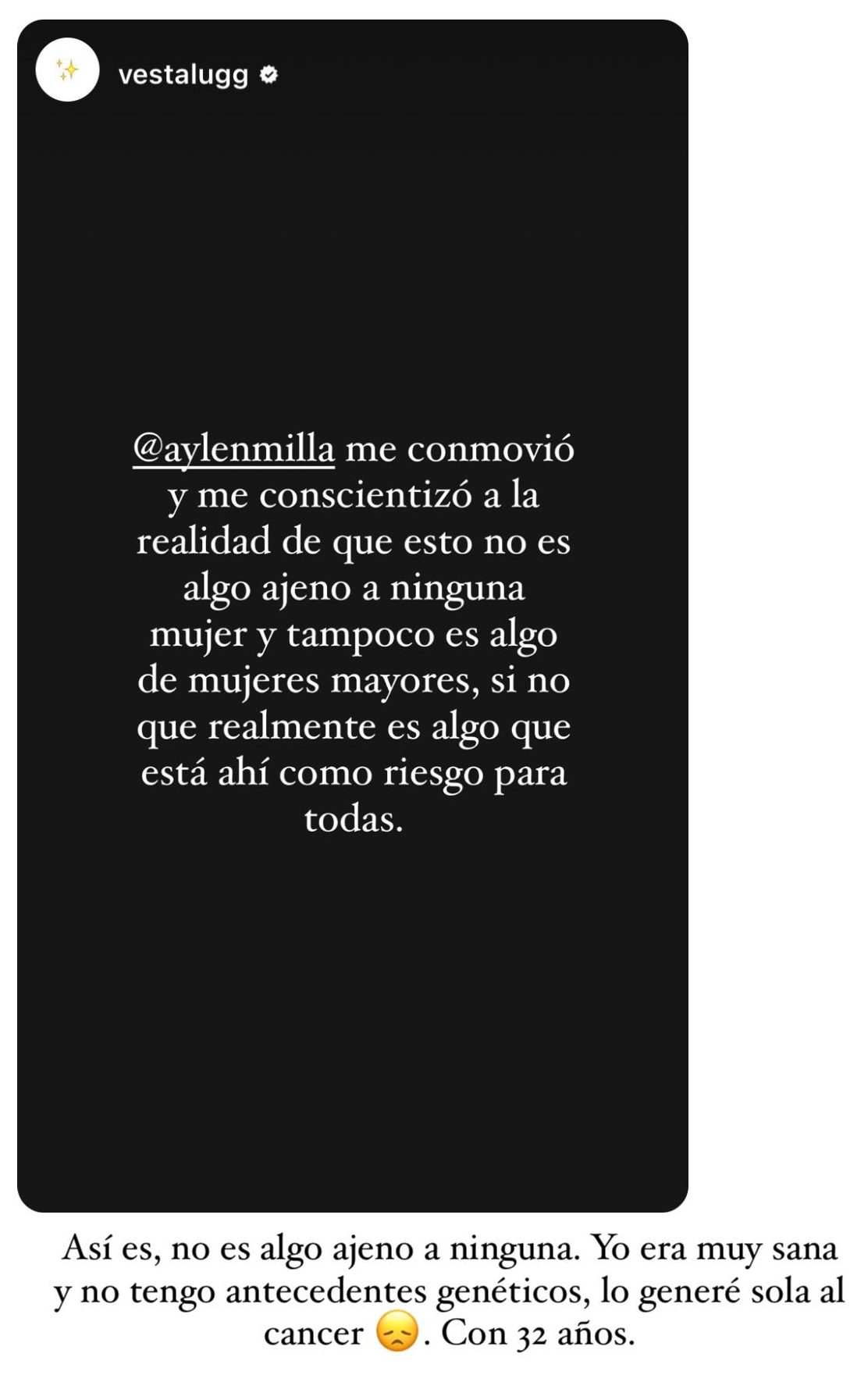 En otro posteo, la cantante nacional ahondó más en el tema y explicó que "Aylén Milla me conmovió y me concientizó a la realidad de que esto no es algo ajeno a ninguna mujer y tampoco es algo de mujeres mayores, sino que realmente es algo que está ahí como riesgo para todas".