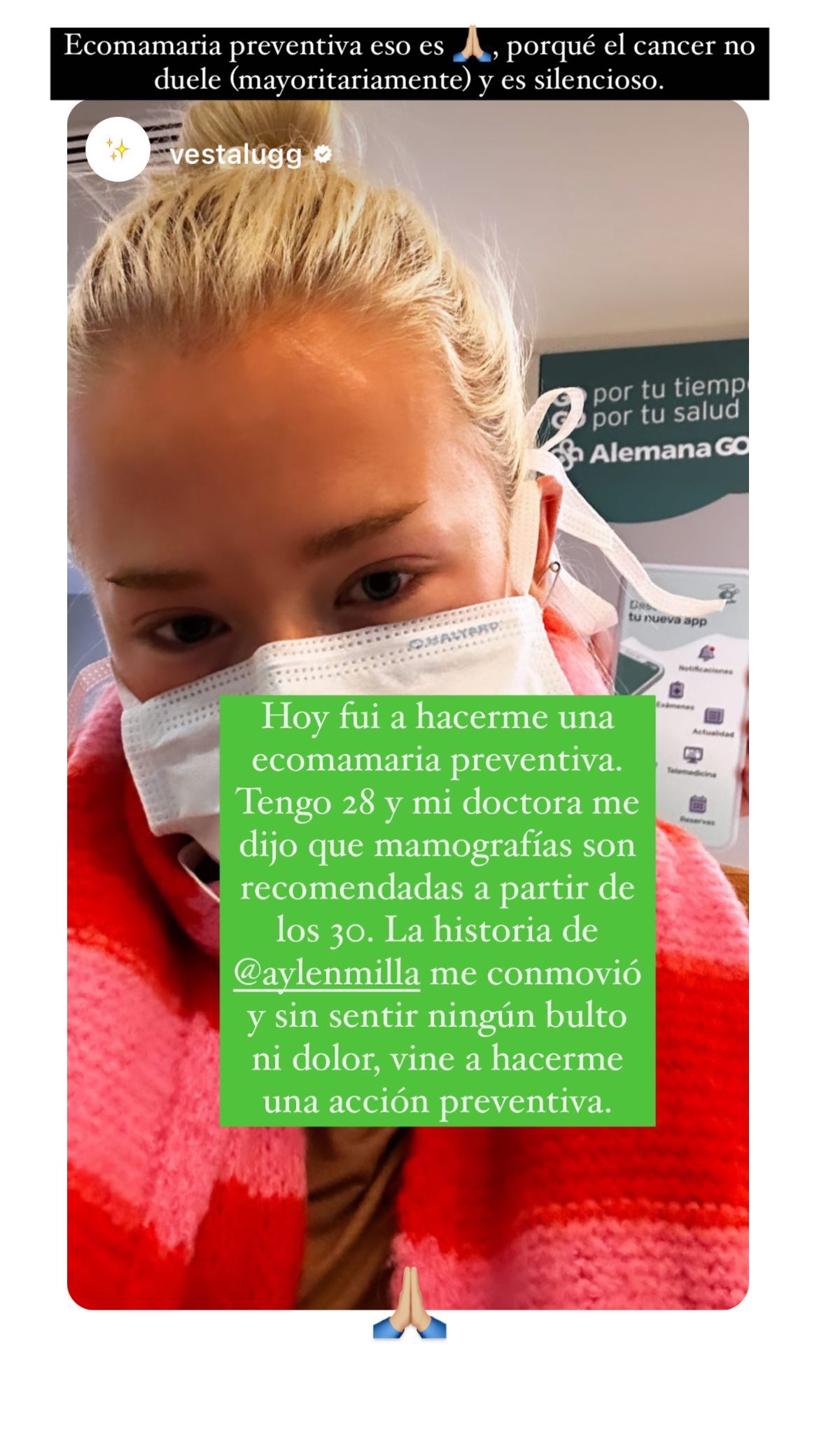 "Hoy fui a hacerme una ecomamaria preventiva. Tengo 28 y mi doctora me dijo que mamografías son recomendadas a partir de los 30. La historia de Aylén Milla me conmovió y sin sentir ningún bulto ni dolor, vine a hacerme una acción preventiva", reveló en sus stories.