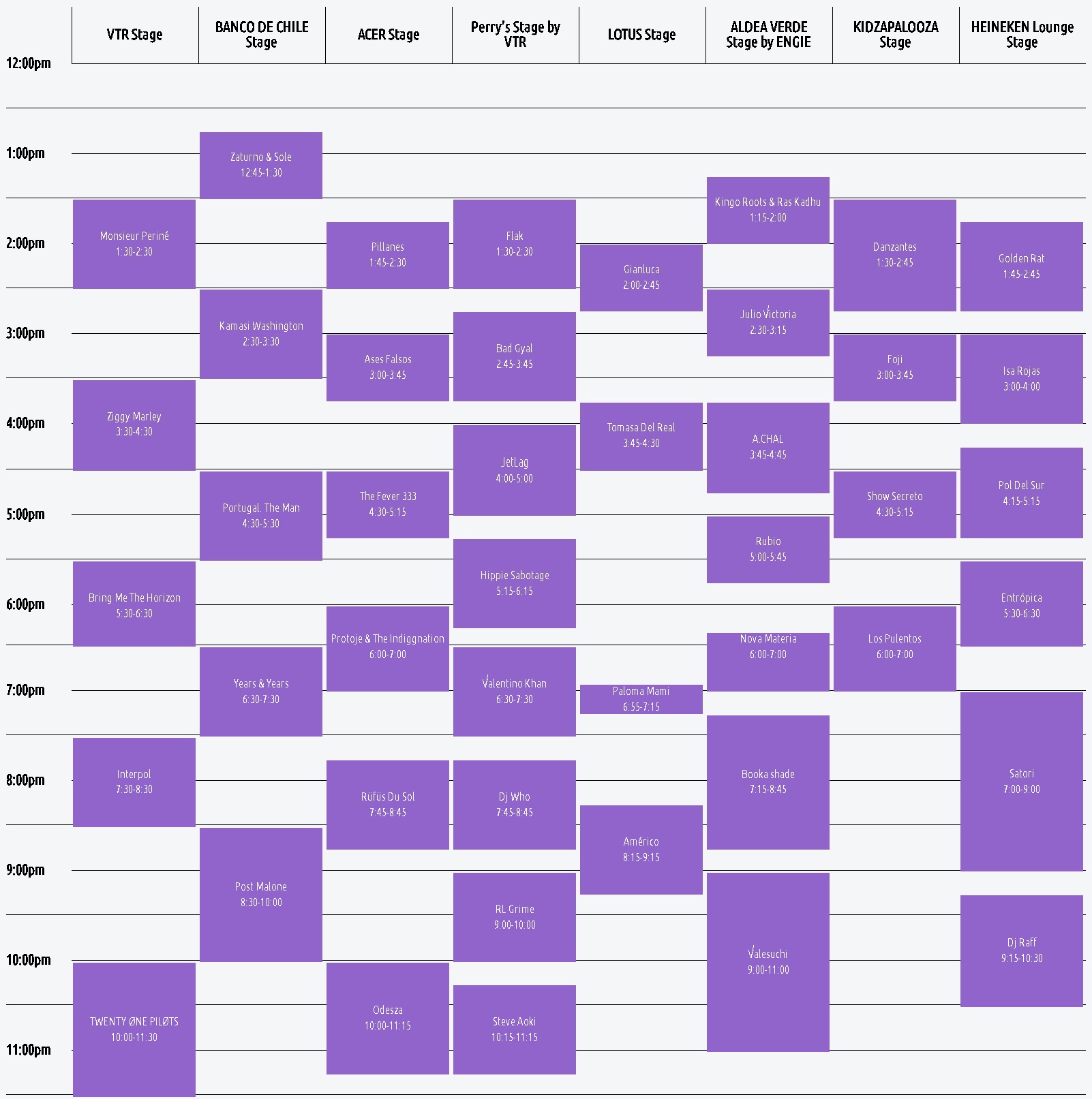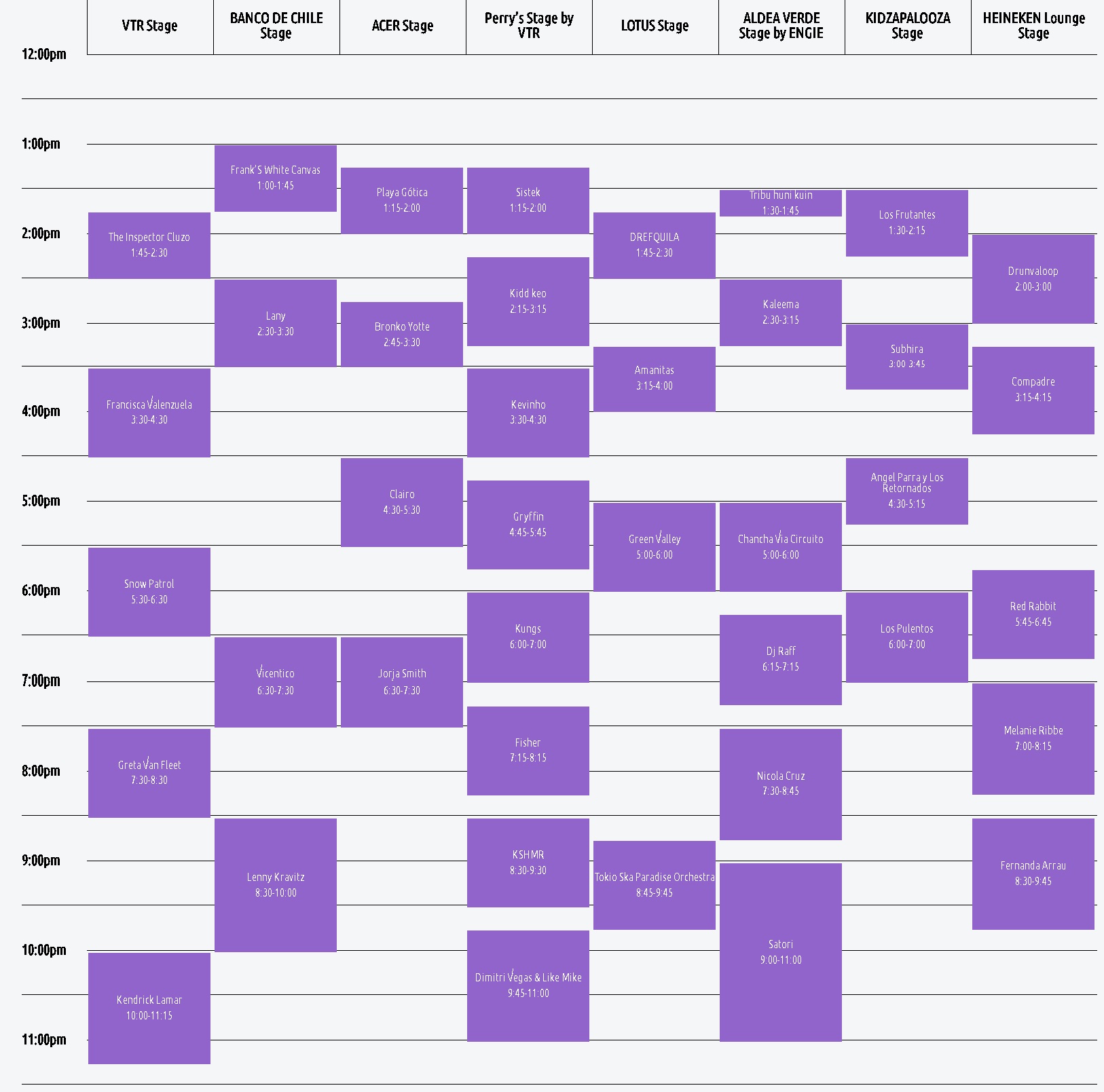 Ya están disponibles todos los horarios y extensión de los shows que presentarán los artistas en Lollapalooza, el que se realizará entre el viernes 29, sábado 30 y domingo 31 de marzo en el Parque O'Higgins.