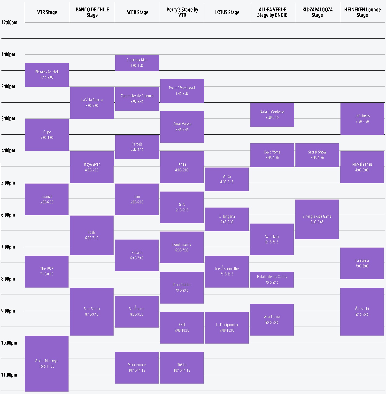 La última jornada comenzará con la banda ganadora del programa Música a un Metro, Cigarbox Man (13:00 horas), y contará con artistas como The 1975 (19:15), Rosalía (18:45), Sam Smith (20:15), St. Vincent (20:30). La noche concluirá con Arctic Monkeys (21:45) cerrando el VTR Stage, coincidiendo con Macklemore, que estará en el Banco de Chile Stage a las 22:15 horas.