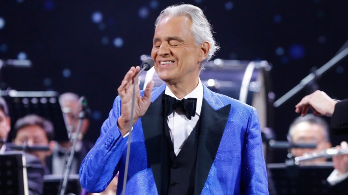 se detuvo para arreglar la corbata humita que estaba utilizando Andrea Bocelli,