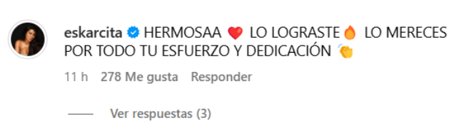 Aún sí, la noche de este lunes, Escarlette Gálvez reconoció el triunfo de Casanova y le dejó un cálido mensaje festejando su logro: "HERMOSAA ❤️ LO LOGRASTE🔥 LO MERECES POR TODO TU ESFUERZO Y DEDICACIÓN 👏", escribió.