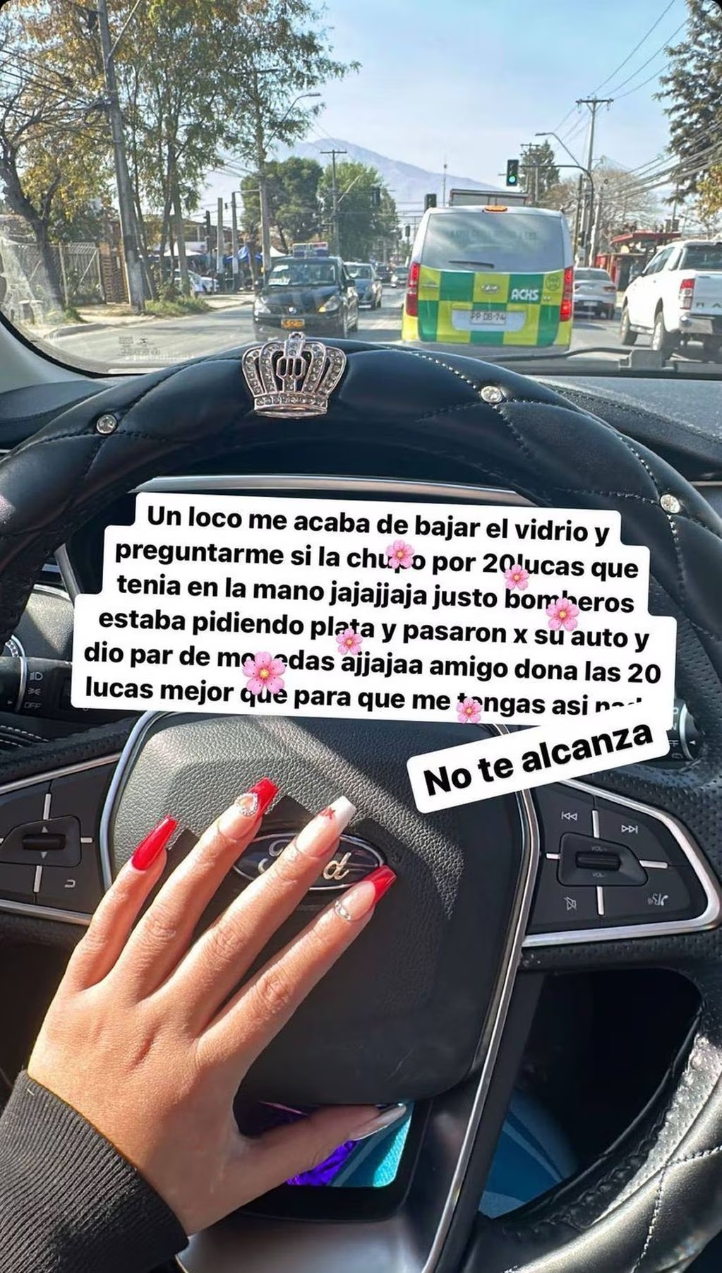 Y por eso no es de extrañar que haya relatado a través de sus historias de Instagram un incómodo momento que vivió mientras manejaba su auto.“Un loco me acaba de bajar el vidrio para preguntarme si la chu... por 20 lucas”, comenzó explicando la joven, quien además indicó que el sujeto incluso le habría mostrado un billete que tenía en su mano.