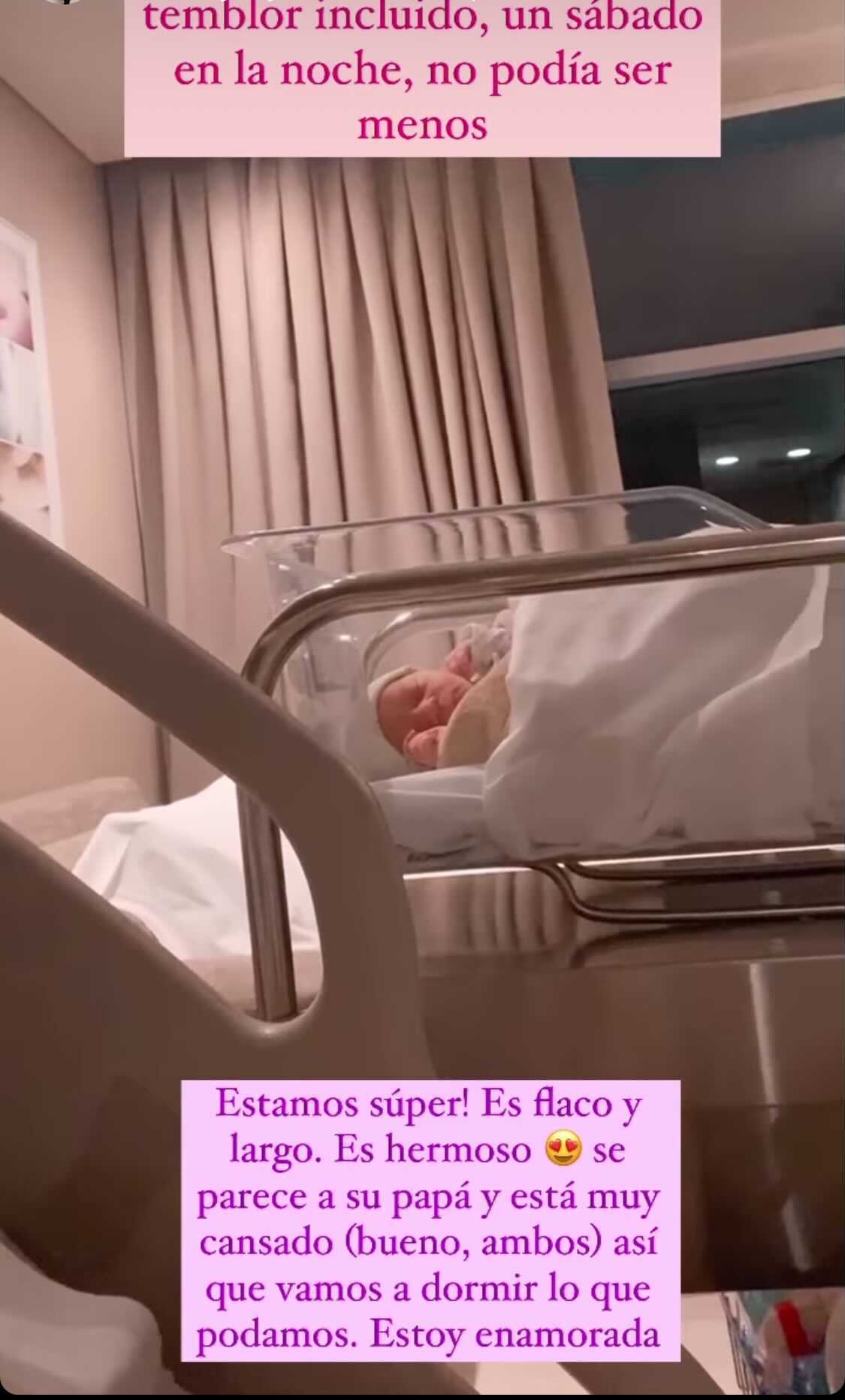 "Estamos súper, es flaco y largo. Es hermoso, se parece a su papá y está muy cansado (bueno ambos), así que vamos a dormir. Estoy enamorada", agregó en el video donde mostró el rostro del bebé que dormía junto a ella.