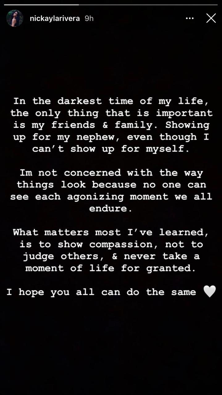 Nickayla Rivera respondió al revuelo que causó la noticia a través de su cuenta de Instagram, donde señaló que "en el momento más oscuro de mi vida, lo único que importa son mis amigos y mi familia".