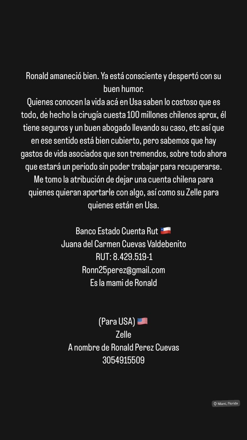 Durante este jueves, la familia de Ronald informó que "amaneció bien, ya está consciente y despertó con su buen humor", sin embargo, explicaron que la operación tuvo un costo de $100 millones de pesos chilenos.