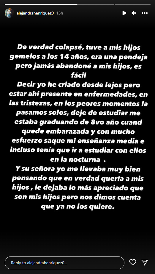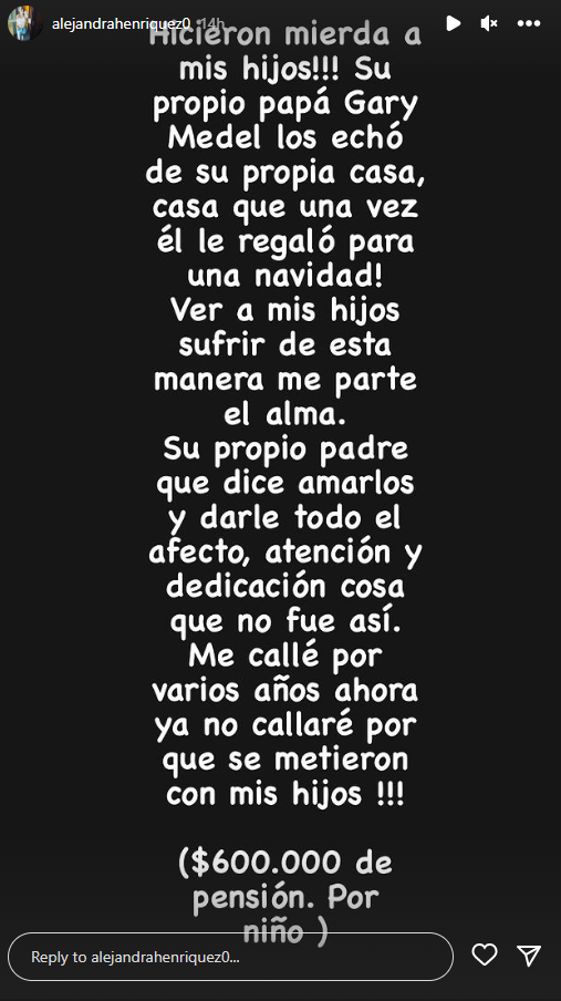 A través de redes sociales, Alejandra Henríquez atribuye al futbolista el haberle regalado una casa a los hijos que tienen en común, la que le habría quitado luego. Además, reclama que el monto de la pensión que paga el Pitbull es baja. Hasta el momento, Medel no se ha referido a las acusaciones.
