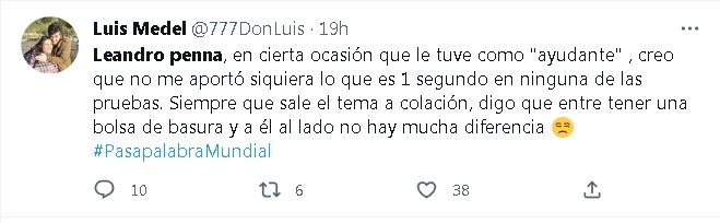 A los comentarios de los televidentes se sumó Medel, ex participante de Pasapalabra y quien también tuvo a Penna en su equipo en alguna oportunidad.