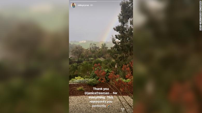 “Gracias @janicefreeman … por todo. Esto te representa perfectamente”, escribió Cyrus en la parte superior de una imagen de un arco iris.