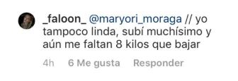 En medio de los elogios, la rubia respondió a una de sus seguidoras, le explicó que subió mucho de peso en su embarazo y que aún le faltan 8 kilos por bajar.