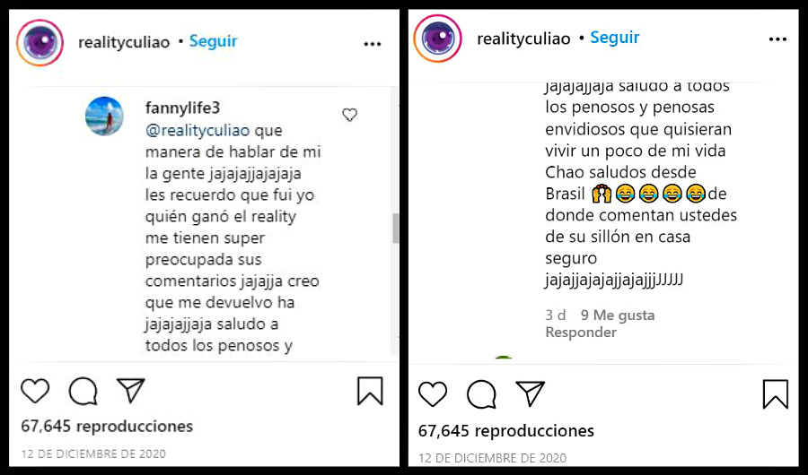 “Qué manera de hablar de mi la gente”, escribió en una cuenta que se dedica a subir contenidos de reality shows, donde luego agregó: “Saludo a todos los penosos y penosas envidiosos que quisieran vivir un poco de mi vida”.