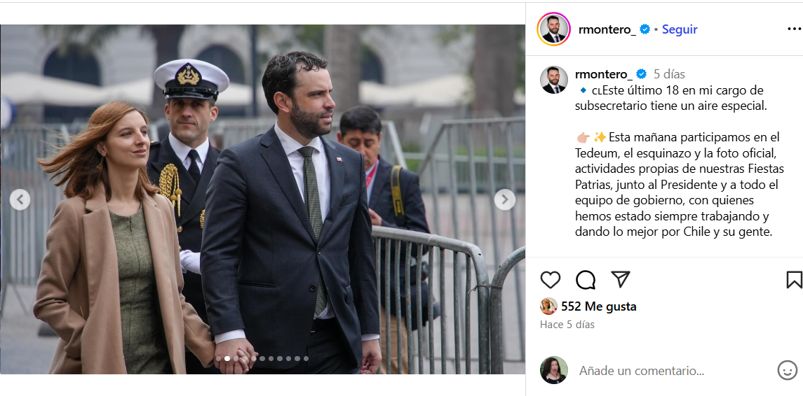 El subsecretario de Defensa compartió un compilado de fotos de un acto de celebración de Fiestas Patrias y entre ellas incluyó dos junto a la actriz.