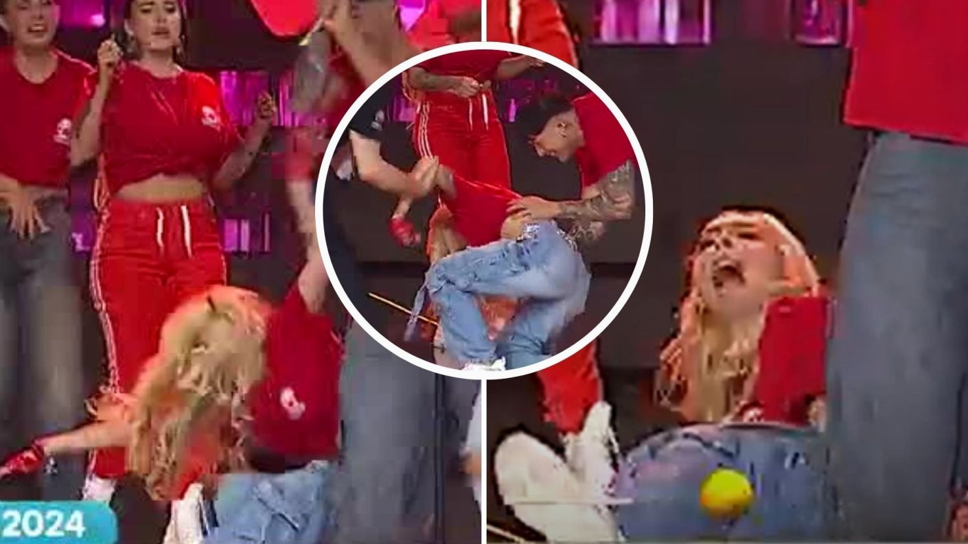 La cantante intentó por todos los medios ganarle al equipo blanco en la prueba de canto de la Teletón 2024, pero no fue posible y sufrió una importante caída.
