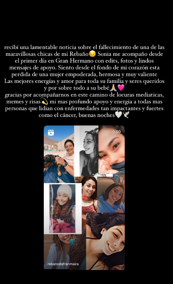 "Recibí una lamentable noticia sobre el fallecimiento de una de las maravillosas chicas de mi rebaño", partió señalando en una historia.
