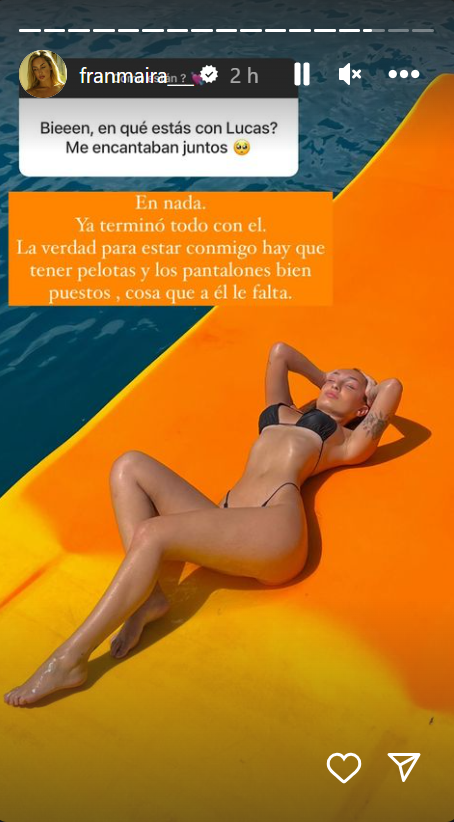 La ex Gran Hermano confirmó a través de sus redes sociales el término de su relación con Lucas Crespo a horas del polémico video del chico reality bailando apasionadamente con una mujer en un evento.