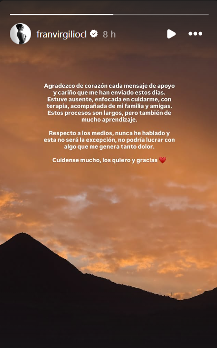 “Respecto a los medios, nunca he hablado y esta no será la excepción. No podría lucrar con algo que me causa tanto dolor. Cuídense mucho, los quiero y gracias”, aseguró.