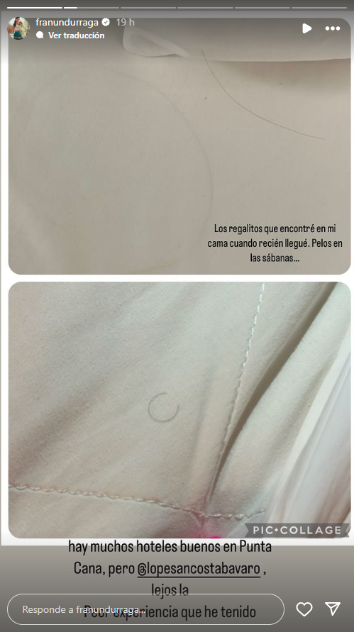 En una imagen que evidencia la acusación, la modelo mostró esta grave falencia higiénica tras encontrar pelos en las sábanas apenas llegó a su habitación por primera vez.