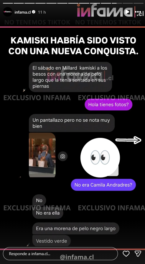 El medio consultó si existían fotografías y si la mujer mencionada era Camila Andrade. Sin embargo, la fuente descartó esa posibilidad: "No, no era ella. Era una morena de pelo negro largo, vestido verde".