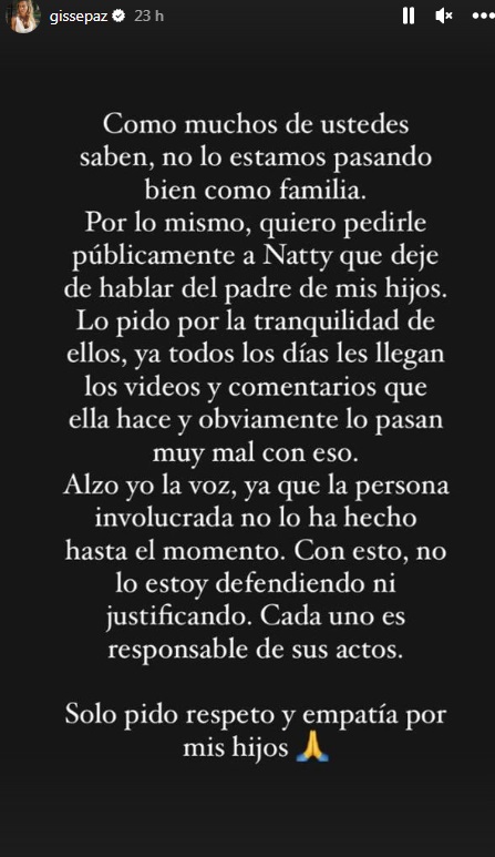 "Lo pido por la tranquilidad de ellos, ya todos los días les llegan los videos y comentarios que ella hace y obviamente lo pasan muy mal con eso", continúa el mensaje.