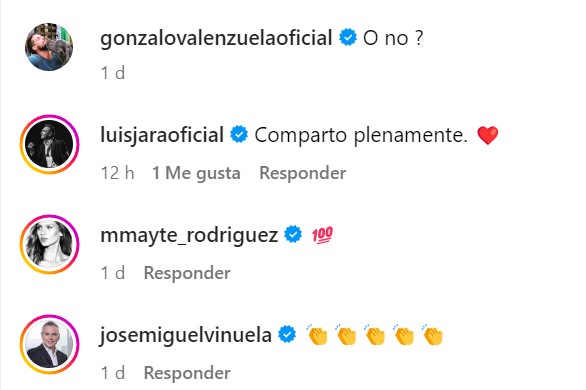 El post se llenó de elogio, entre ellos, una serie de famosos como Luis Jara, quien escribió "comparto plenamente", mientras que Mayte Rodríguez y José Miguel Viñuela dejaron emojis a favor lo expresado por el actor.